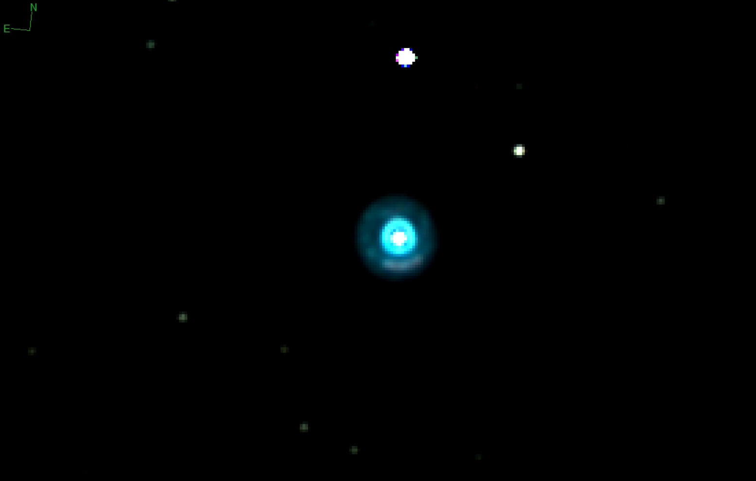 Neptun „ertrinkt“ in der Abenddämmerung. Mit einer Helligkeit von 7.9mag und einem Planetenscheibchen von gerade einmal 2,2“ kann Neptun selbst mit einem Teleskop nicht mehr sinnvoll beobachtet werden.