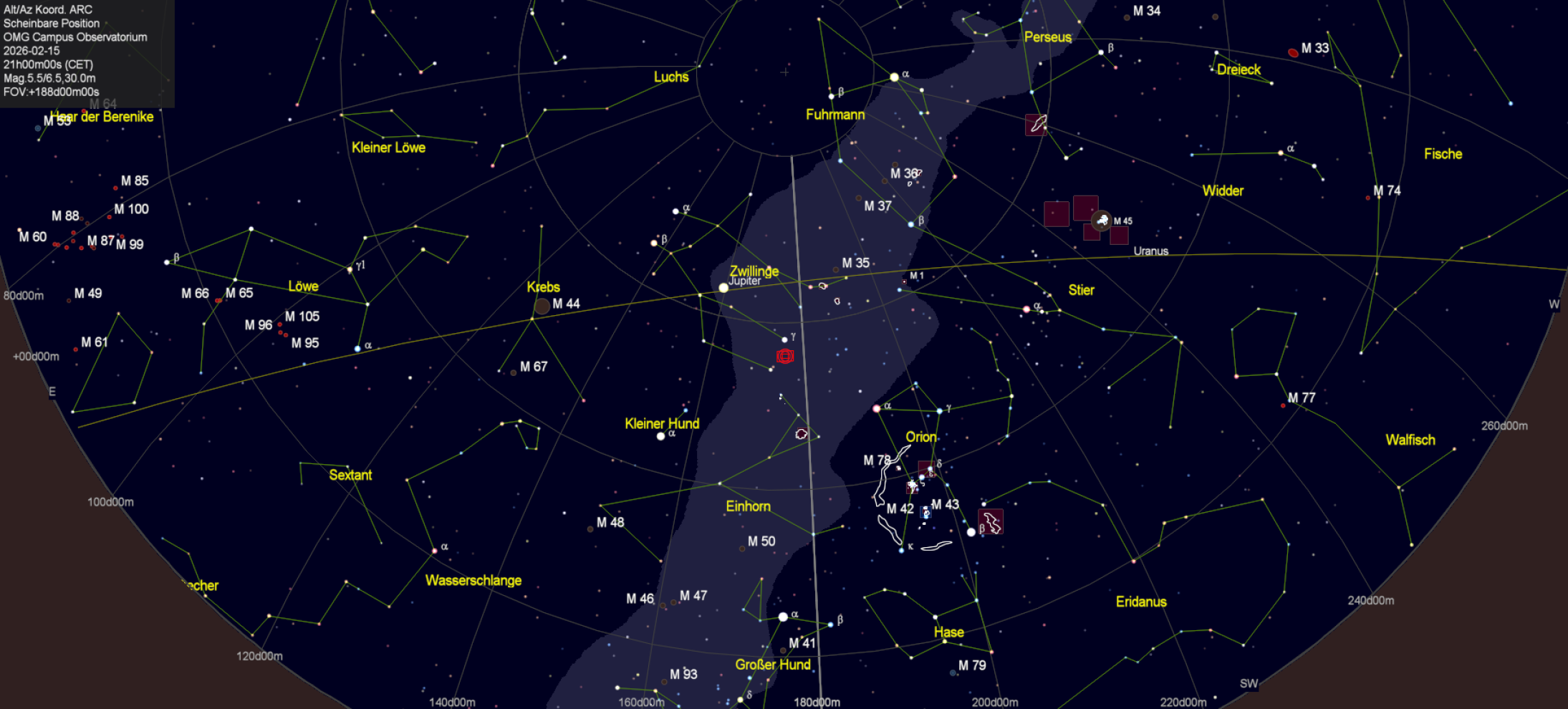 Das markante Sternbild Orion hat den Meridian bereits überschritten. Besonders auffällig sind seine drei nahezu gleich hellen Gürtelsterne Alnitak, Alnilam und Mintaka, allesamt heiße, massereiche O- bzw. B-Sterne mit Entfernungen von mehreren hundert Lichtjahren. Der rötlich leuchtende Schulterstern Beteigeuze ist ein Roter Überriese, dessen Radius mehrere hundert Sonnenradien beträgt und der sich in einem späten Stadium seiner Entwicklung befindet.