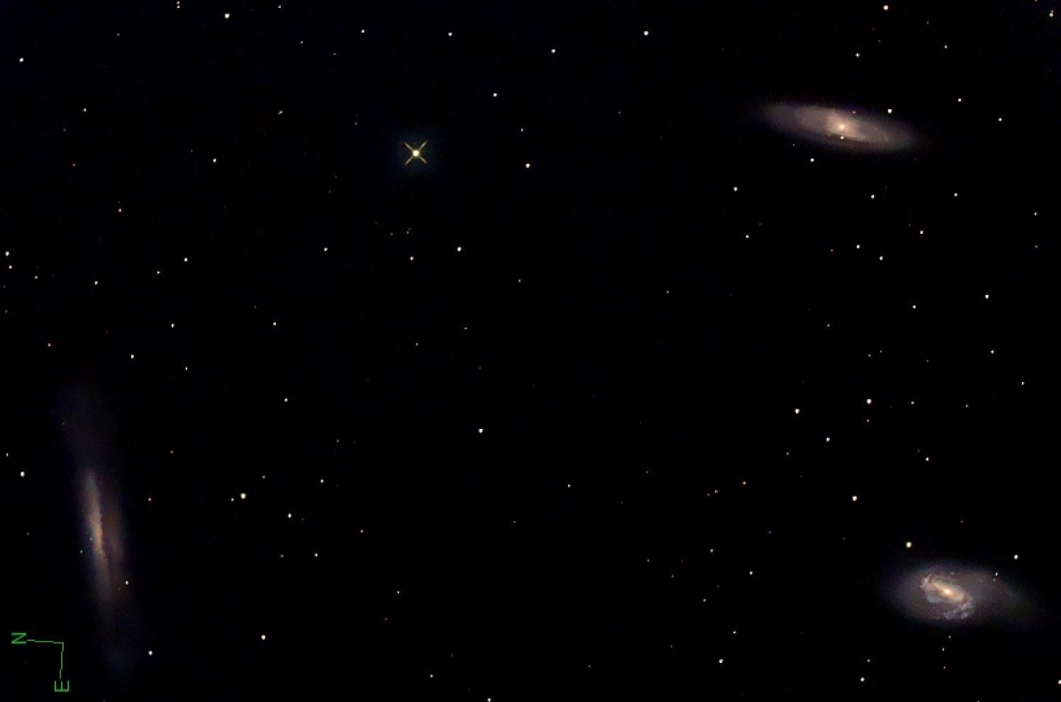 Die drei Galaxien M65, M66 und NGC 3628 im Sternbild Leo stehen eng beieinander und bilden das s.g. „Leo-Triplett“. Die Entfernung zu diesem Galaxien-Trio beträgt ca. 35 Millionen Lichtjahre. M65, die am weitesten im Westen stehende Galaxie, sehen wir unter kleinem Winkel. Deutlich erkennbar ist ein dunkles Staubband in der Galaxienebene. M66, die südlichste der drei Galaxien, beeindruckt mit zwei ausladenden Spiralarmen und einem länglichen Zentrum. Die dritte Galaxie im Bunde ist NGC 3628, bei der wir ein dickes Staubband fast genau von der Kante sehen.