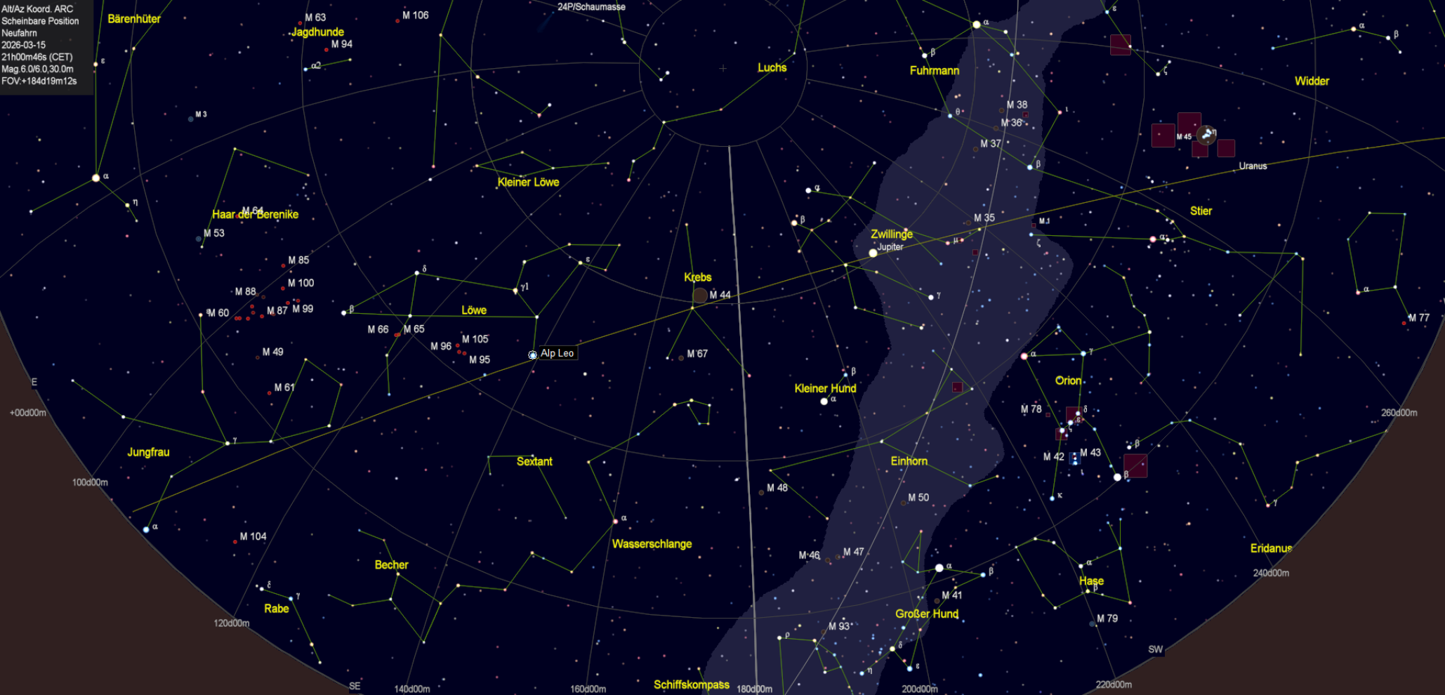 Der Sternhimmel am 15. März 2026 um 21:00 CET (Cartes du Ciel) (GNU GENERAL PUBLIC LICENSE Version 2, June 1991)