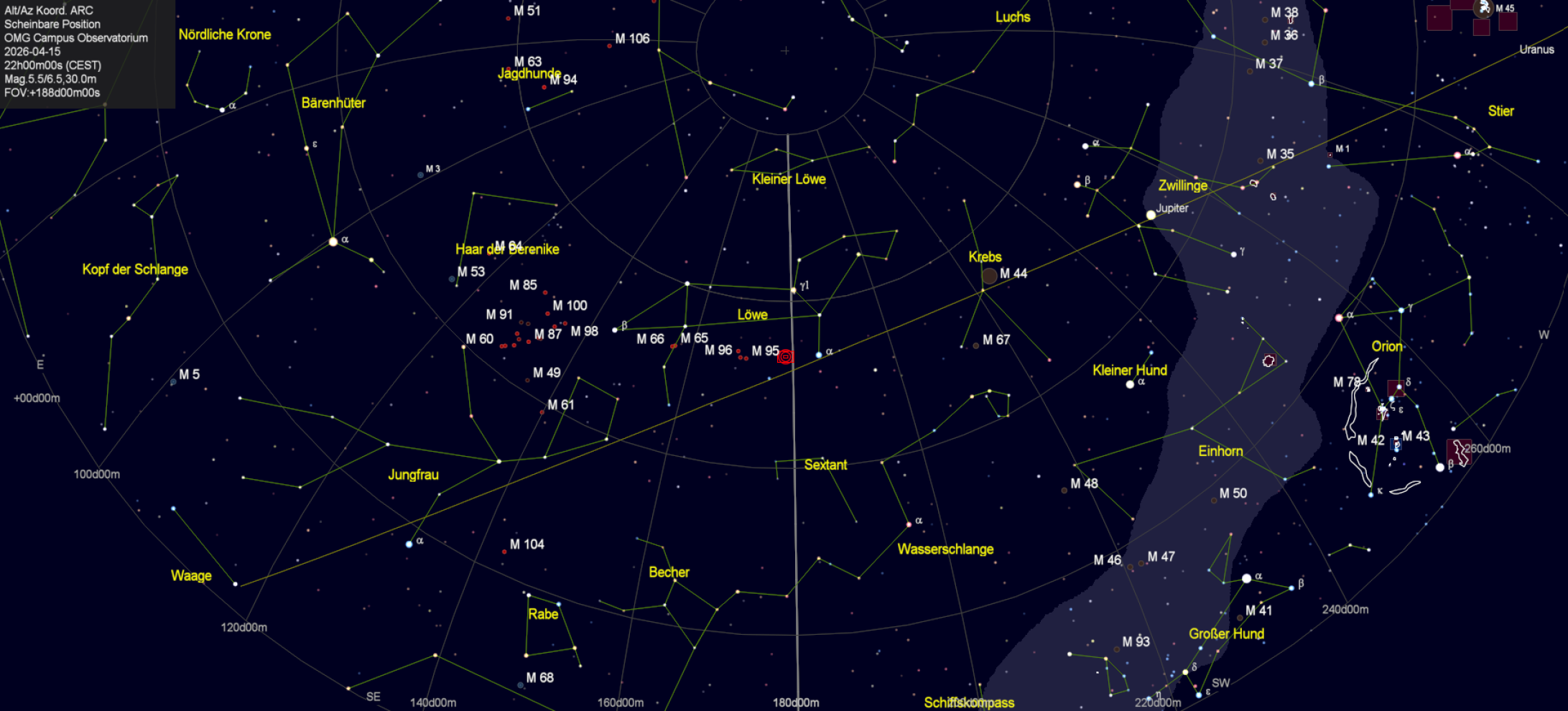 Der Löwe (Leo) steht nun hoch am Südhimmel und ist eines der auffälligsten Sternbilder dieser Jahreszeit. Sein hellster Stern Regulus (α Leonis) liegt weiterhin nahe der Ekliptik und markiert den „Herzstern“ des Löwen.