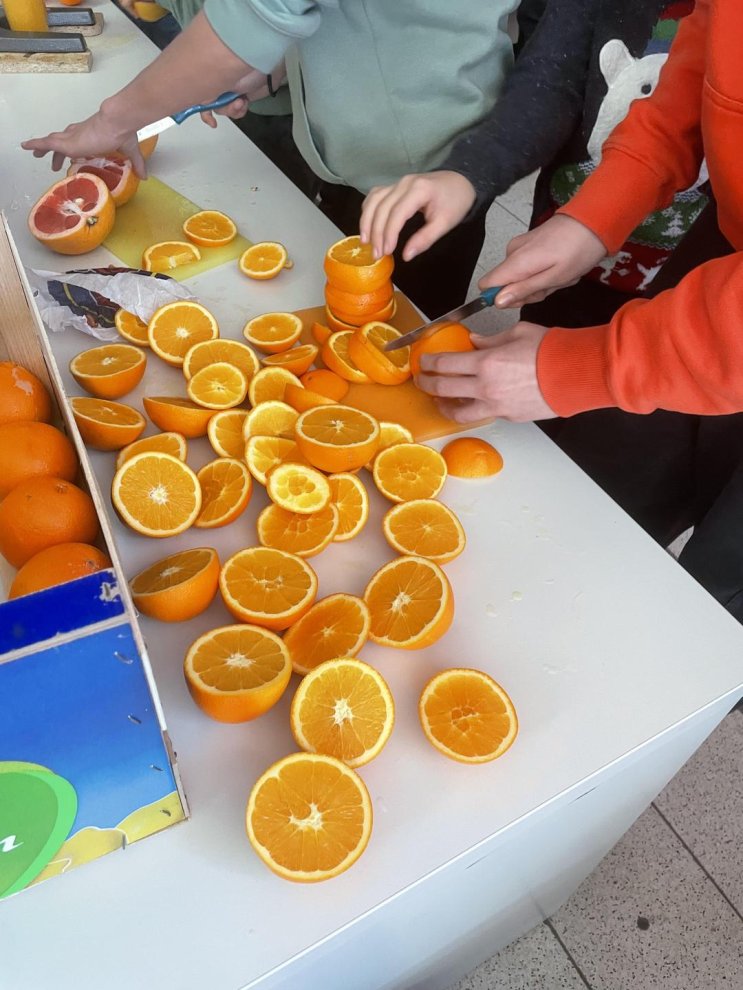 Endlich war es wieder so weit: Der nächste Juiceday stand am 18.12.2025 bevor! Mit viel Liebe zum Detail und bereits gesammelter Erfahrung aus dem letzten Jahr wurde der nächste Saftausschank geplant. Das Konzept blieb gleich: Es sollte in der ersten und zweiten Pause nicht nur frisch gepresste Orangensäfte, sondern auch Apfel- und Grapefruitvarianten angeboten werden – man konnte die Vitamine geradezu in den leckeren Fruchtsäften schmecken! Dem AK Umwelt lag natürlich auch wieder die Herkunft der Früchte am Herzen, weswegen man erneut eng mit dem Pflüglerhof aus Neufahrn zusammenarbeitete: Frau Pflügler kaufte die Früchte am Morgen um 4:00 Uhr am Großmarkt, Herr Vogt holte sie wiederum um 7:00 Uhr direkt am Pflüglerhof ab und um 9:20 Uhr wurden sie dann in der ersten Pause verkauft – frischer geht es nicht!
